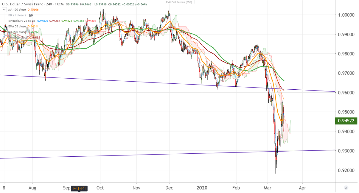 USDCHF showed a massive recovery of more than 350 pips after a sell-off of 650 pips. The decline due to the outbreak of coronavirus has increased demand for a safe-haven asset like yen, gold. The pair hits high of 0.95694 and is currently trading around 0.94468.