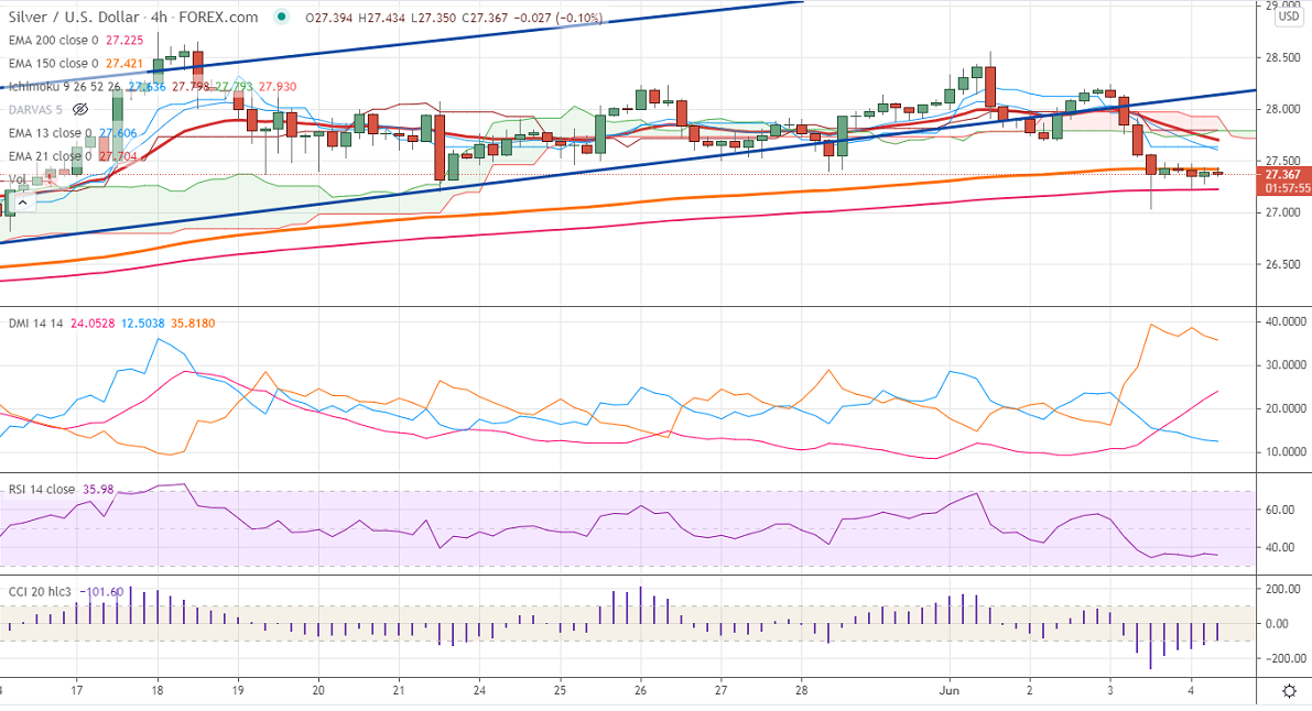 Silver has lost more than $1 yesterday due to board–based US dollar buying. The upbeat economic data and comments from Fed members on bond-buying tapering are supporting the US dollar at lower levels. The US private sector has added 978000 jobs in May much better than the forecast of 650K. The number of people who have filed for unemployment benefits declined to 385K for the week ended May 28 vs an estimate of 395K. The US dollar is holding above 90.50 levels, a jump till 91. The US 10- year yield surged more than 3% from a low of 1.584%. XAGUS hits an intraday high of $27.43 and is currently trading around $27.382.