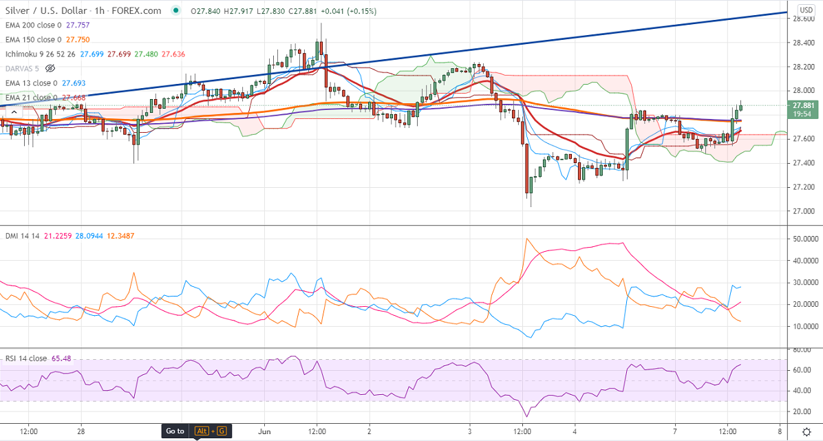Silver has recovered more than 0.80 cents from the low of $27.03 due to weak US jobs data. US economy has added 559000 jobs in May much less forecast of 645K. The unemployment rate declined to 5.8% from the previous month to 6.1%. The US dollar is holding below 90 levels, a dip till 89.20. The US 10- year yield lost more than 5% to 1.55%. XAGUS hits an intraday high of $27.91 and is currently trading around $27.87.