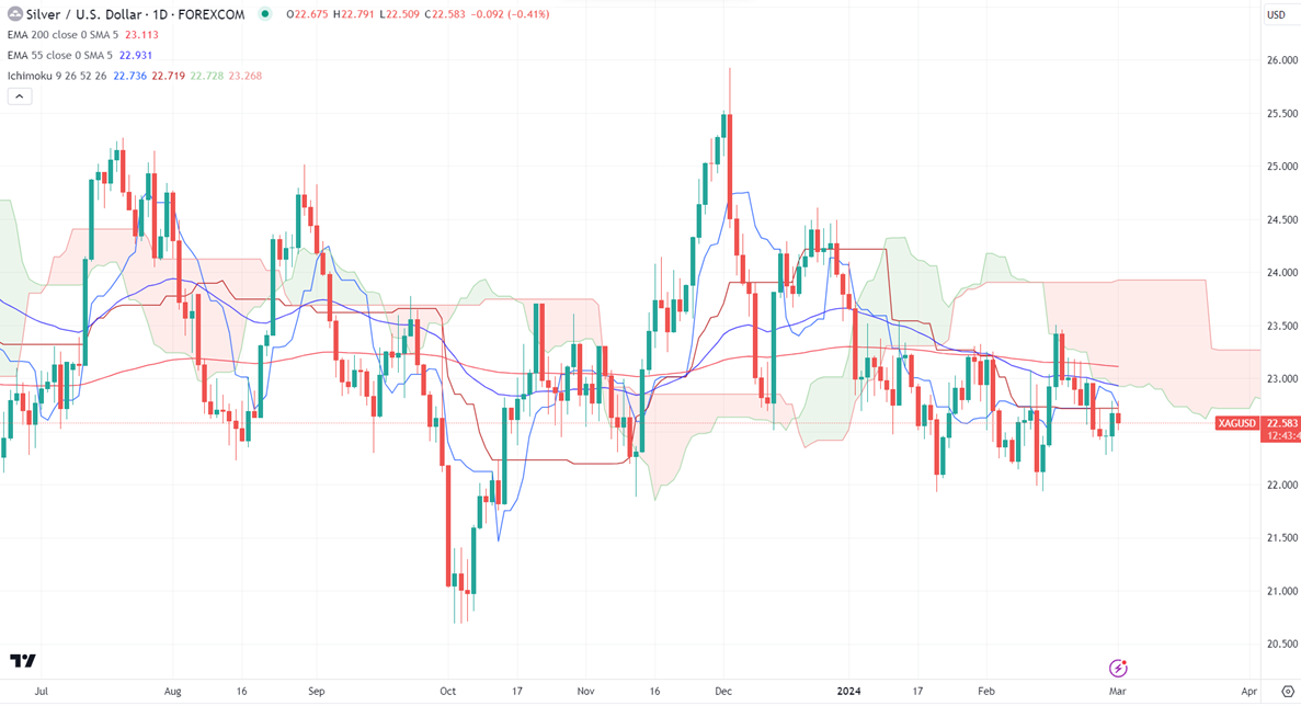 It trades below 21, 55- EMA, and 200 EMA in the 4-hour chart. The near-term support is around $22.25 and a break below $22.20 targets $21.90/$21.40/$20.68.