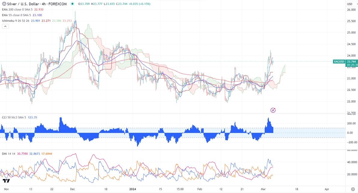 Silver pared some of its gains after hitting a multi-month high. The increased chance of a rate cut by the Fed in June is supporting precious metals at lower levels. It hit a high of $24.22 and is currently trading around $23.67.