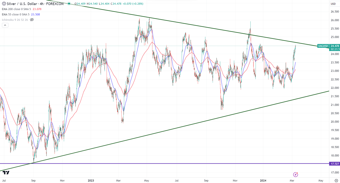 Silver recovered sharply and hit a fresh year high on board-based US dollar selling. Major central banks like the ECB and Fed hinted at an early ate cut this year due to easing inflation supporting the precious metal at lower levels. It hit a high of $24.50 and is currently trading around $24.498.