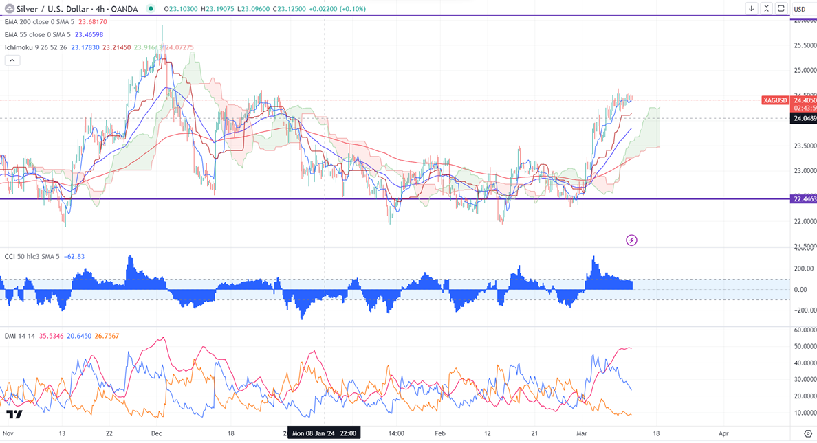It trades above 21, 55- EMA, and 200 EMA in the 4-hour chart. The near-term support is around $24 and a break below targets of $23.60/$23.10/$22.75/$22.30. On the higher side, immediate resistance is around $24.60, any breach above targets $25/$25.90.