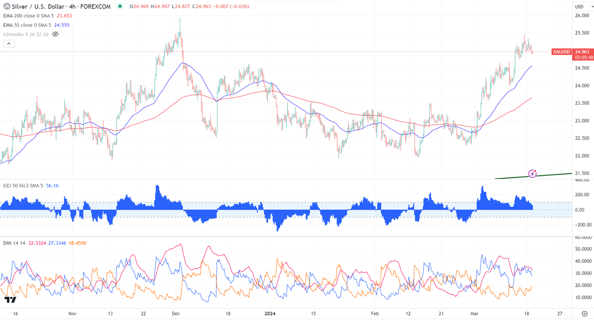 The Silver lost its shine on strong US dollar buying. The result of decreasing hopes of the Fed early rate cut, putting pressure on Silver at lower levels. It hit a low of $24.87 and is currently trading around $24.97.
