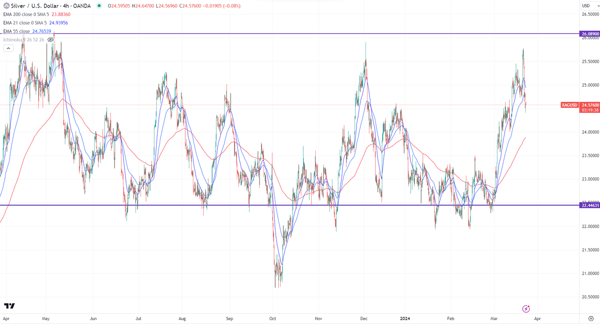 It trades above 21, 55- EMA, and 200 EMA in the 4-hour chart. The near-term support is around $24.40 and a break below the targets of $24/$23.60/$23.25. On the higher side, immediate resistance is around $, any breach above targets is $26.20/$27.