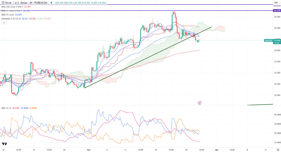 It trades below 21, 55- EMA, and above 200 EMA in the 4-hour chart. The near-term support is around $24.20 and a break below the targets of $24/$23.60/$23.25. On the higher side, immediate resistance is around $24.75, any breach above targets is $25/$25.70/ $26.20/$27.