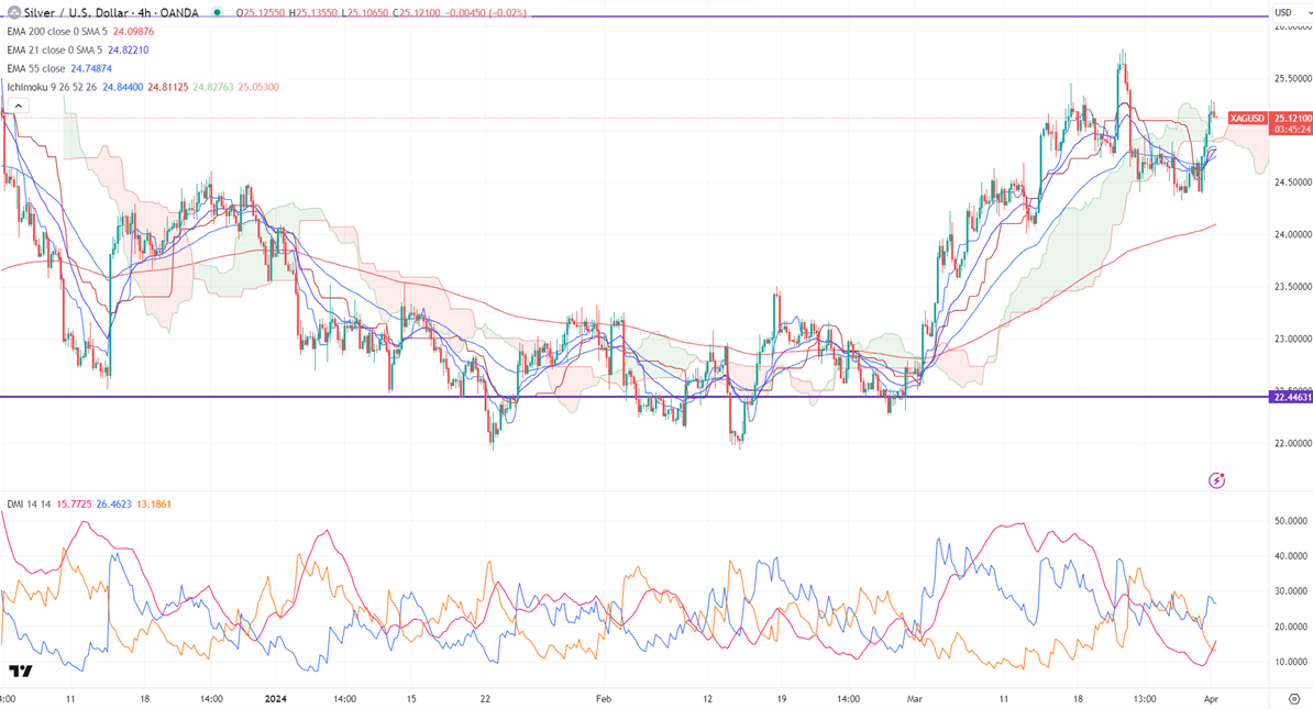 It trades below 21, 55- EMA, and above 200 EMA in the 4-hour chart. The near-term support is around $24.75 and a break below the targets of $24.20/$24/$23.60/$23.25. On the higher side, immediate resistance is around $25.30, any breach above targets is $25.70/ $26.20/$27.