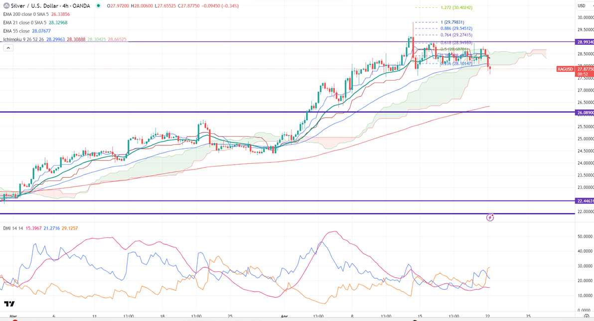 It trades above 21, 55- EMA, and above 200 EMA in the 4-hour chart. The near-term support is around $27.50 and a break below the target of $27.20/$26.85/$26.25. On the higher side, immediate resistance is around $28.25, and any breach above targets is $28.68/$29.25/$29.53/$30.