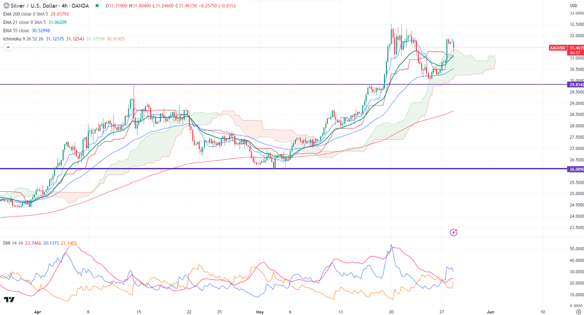 Silver showed a minor pullback on the weak US dollar. It hit a high of $31.89 at the time of writing and is currently trading around $31.47.