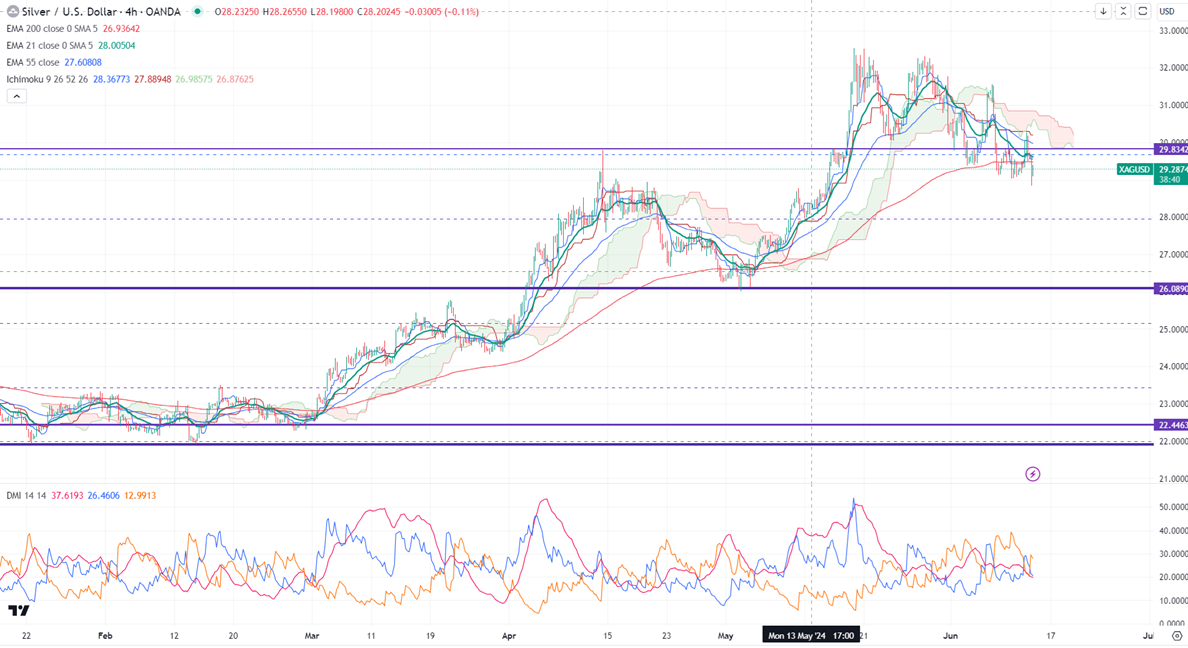 Silver pared some of its gains after Fed hawkish shift. It hit a low of $28.84 yesteerdayand is currently trading around $29.348.