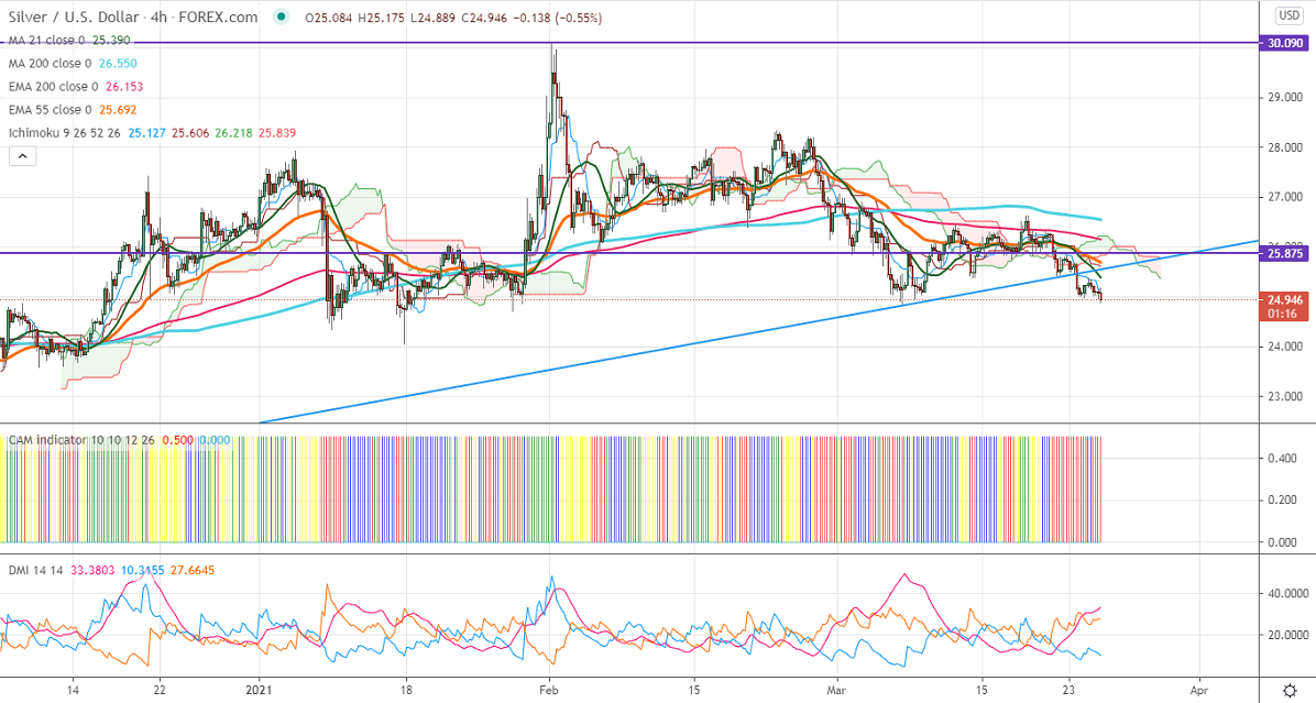 Technically, silver's significant support is around $24.80 (Mar 5th low), violation below will drag the pair down to $24.05-24.15. Significant bearishness can be seen only if it breaks below $24.The near-term resistance is at $25.55 (support turned into resistance), any surge past targets $26/$26.65/$27 is possible.