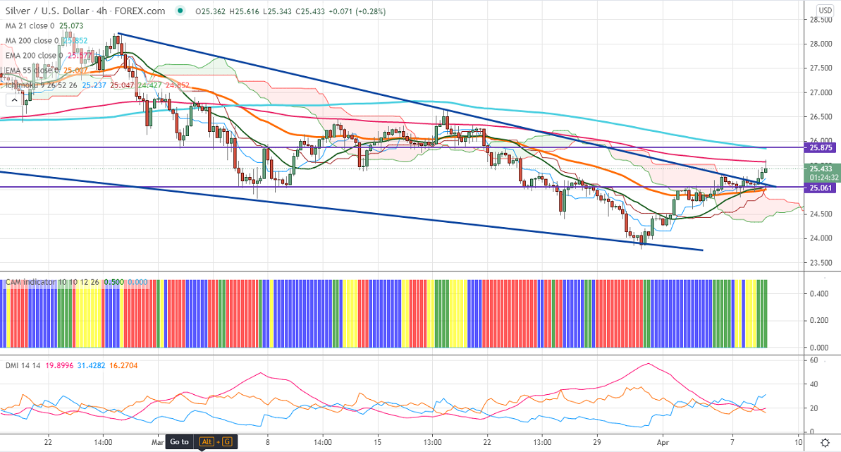 Silver is trading higher and surged more than 1% from yesterday's close. The weakness in the US dollar and bond yield due to dovish FOMC minutes is supporting Silver prices. The US 10-year yield declined more than 2% and the major sell-off it fit breaks 1.589% (Mar 25th, 2021 low). US dollar index trades softer and major weakness if it breaks below 91.80. The number of people filed for unemployment benefits rose 744K last week compared to a forecast of 682K. It hits an intraday high of $25.616 and is currently trading around $25.535.