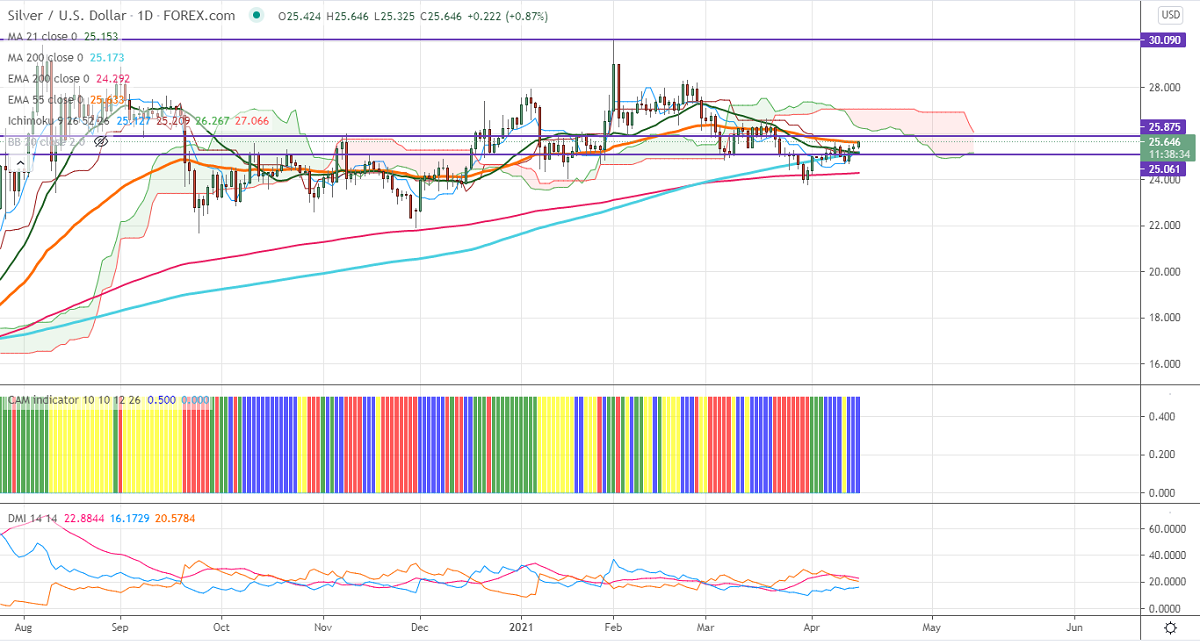 Silver is trading higher for third consecutive days and surged nearly 0.90 cents on the weak US dollar. US dollar index is in the bearish mode and holding well below 92 and close below 91.50 confirms further bearishness. The minor selling in US bond yield also supporting precious metal. The US 10-yield declined more than 5% despite better than expected US CPI data. Markets eye US retail sales, jobless claims, and Philly Fed manufacturing index for further direction. It hits an intraday high of $25.635 and is currently trading around $25.616.