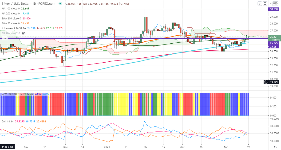 Technically, silver's significant support is around $25.75 (100- day MA), violation below will drag the pair down to $25.45/$25.25/$25. Significant bearishness can be seen only if it breaks below $24.60.The near-term resistance is at $26.30, any surge past targets of $26.65/$27 is possible.