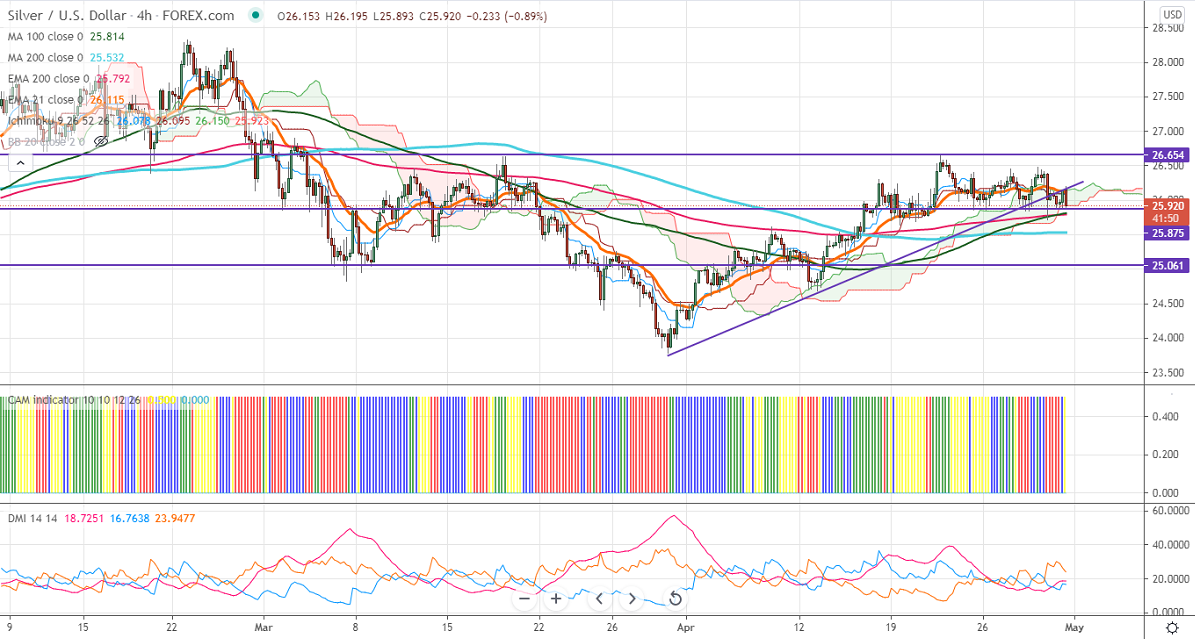 Silver has formed a double top around $26.65 and shown a minor weakness. The minor jump in US bond yield is putting pressure on this commodity. . The US 10-year yield jumped more than 10% from a low of 1.53%. US personal income jumped to 21.1% compared to a forecast of 20.1%. The personal consumption expenditure rose 0.4% in Mar vs forecast of 0.3%. The US dollar index recovered sharply from a low of 90.41. Any bullish trend can happen only if it breaks 91.70. Silver was one of the worst performers in the past two months of this year and lost more than 20%. It hits an intraday low of $25.89 and is currently trading around $25.91.