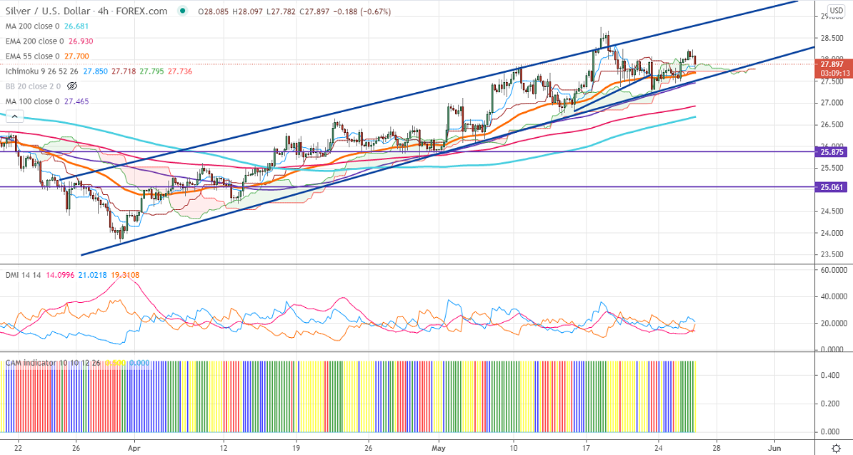 Silver is consolidating in a narrow range between $27.20 and $28.23 despite the weak US dollar. The dovish comments from Fed members confirm that the central bank will not taper the bond-buying program in the near term. The US dollar is struggling to hold above 90 levels, any breach below 89.20 confirms the further bearish trend. The US 10- year yield declined more than 8% from minor top 1.692%. XAGUS hits an intraday high of $28.23 and is currently trading around $27.86.