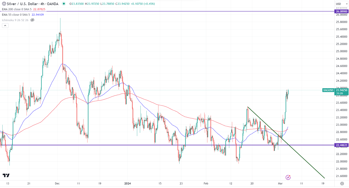 Silver breaks significant resistance at $23.60 after a long consolidation. The chance of a rate cut in June by the Fed has pushed prices of precious metals higher. It hit a high of $23.97 and is currently trading around $23.95.