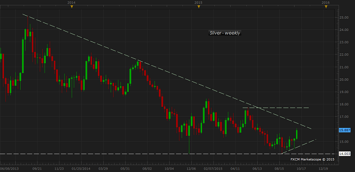 Silver after touching key support level of $14/troy ounce in August as turmoil in financial market unfold after Peoples bank of China (PBoC) devalued Yuan by almost 2%, has been showing signs of some sort of comeback or larger correction.
