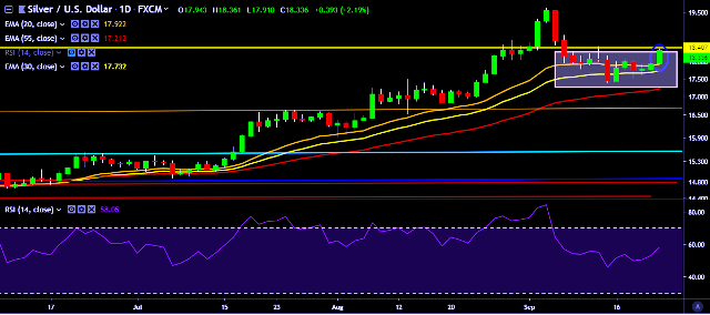 We prefer to take long position on XAG/USD around $18.35, stop loss at $18.15 and target of $18.76.