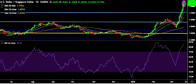 - USD/SGD is currently trading around 1.4539 marks.