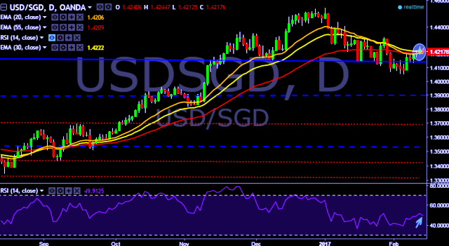 We prefer to take long position in USD/SGD around 1.4215, stop loss 1.4197 and target of 1.4297.