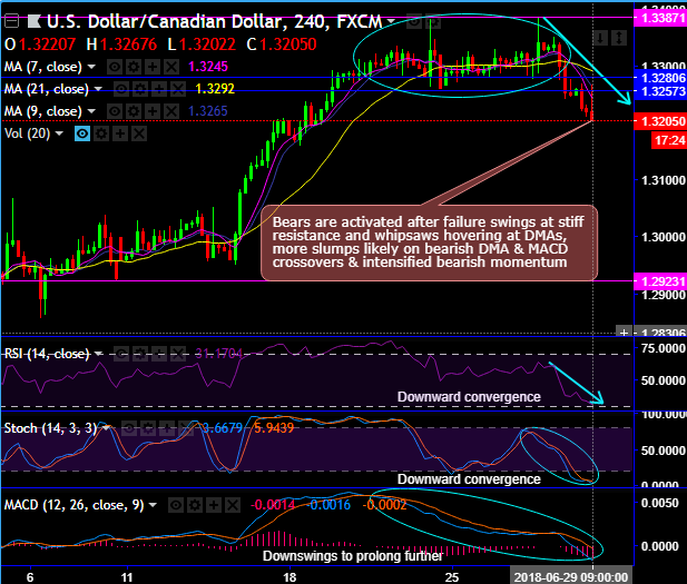 - Technically, near-term resistance is around 1.3280-1.3293 levels and one can expect upswings only upon any convincing break-out above these levels. But for now, the bears are activated after failure swings at stiff resistance of 1.3387 levels and the formation whipsaws pattern that has been hovering at DMAs, consequently, more slumps likely on bearish DMA & MACD crossovers & intensified bearish momentum (RSI & stochastic curves’ downward convergence, refer 4H chart). While the intermediate trend also seems edgy, the occurrence of back-to-back shooting star signal weakness, the momentum oscillators indicate Over Bought pressures, whereas, the trend indicators (EMAs and MACD) still signal bullish swings to prolong further. On the lower side, near-term support is around 1.3157 levels and any convincing break below will drag the pair down till 1.3085 (i.e. 7EMA or even upto 1.3130 levels).