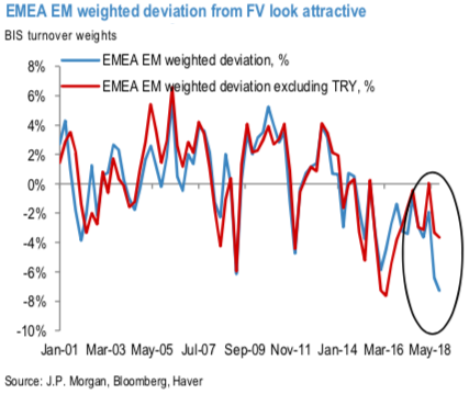 We update below our BEER FV models (see here for the framework). On aggregate, the EM FX sell-off has led to the largest undervaluation since we started the models in Jan-01. However, a substantial portion of this undervaluation is driven by the sell-off in TRY (refer above chart). Excluding Turkey from the sample, the average undervaluation is much more modest. However, we believe only PLN, CZK and, strictly via options, RUB offer value worth positioning for.