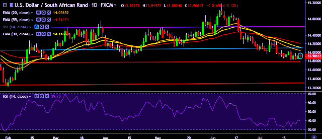 We prefer to take short position on USD/ZAR only below 13.80, stop loss at 14.02 and target of 13.70/13.40.