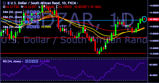 We prefer to take long position on USD/ZAR around 14.15, stop loss at 14.02 and target of 14.38.