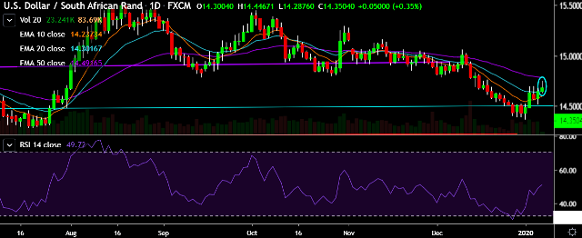 We prefer to take long position on USD/ZAR around 14.20, stop loss at 14.10 and target of 14.70/14.94.