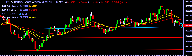 We prefer to take short position on USD/ZAR around 14.22, stop loss at 14.40 and target of 14.02/13.78.