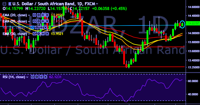We prefer to take short position on USD/ZAR around 14.15, stop loss at 14.30 and target of 14.02.
