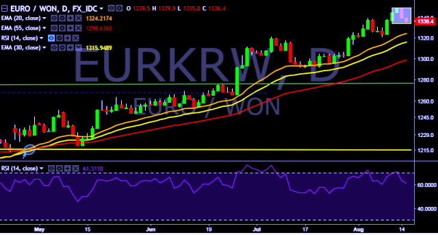We prefer to take short position on EUR/KRW around 1,337, stop loss at 1,349 and target of 1,320.