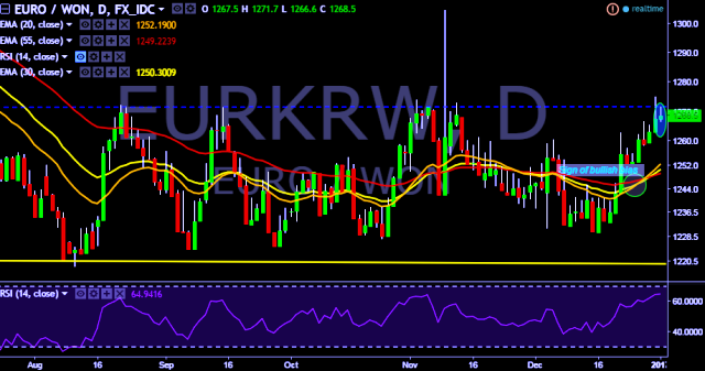 We prefer to go long on EUR/KRW only above 1,270 with stop loss at 1,263 and target of 1,275/1,287.