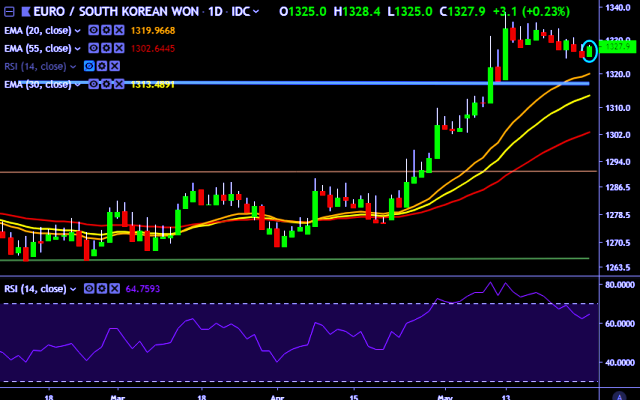 We prefer to take long position on EUR/KRW only above 1,330, stop loss 1,320 and target of 1,358.