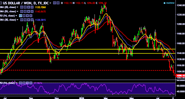 We prefer to take short position in USD/KRW around 1,102 with stop loss at 1,117 and target of 1,078/1,063.