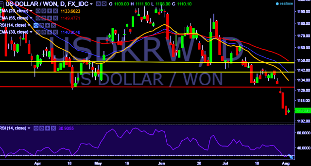 We prefer to take short position in USD/KRW only below 1,105 with stop loss at 1,124 and target 1,095/1,063.