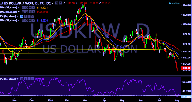 We prefer to take short position in USD/KRW only below 1,105 with stop loss at 1,124 and target 1,095/1,063.