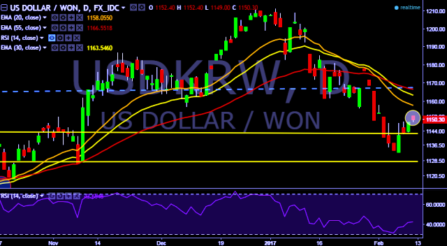 We prefer to take short position in USD/KRW around 1,150, stop loss 1,155 and target of 1,142/1,132/1,127.