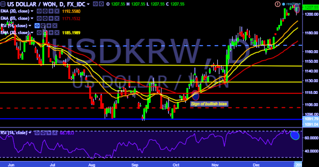 We prefer to go long on USD/KRW only above 1,207 with stop loss at 1,199 and target of 1,220/1,234.