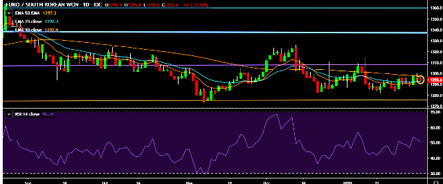 We prefer to take short position on EUR/KRW around 1,295, stop loss at 1,302 and target of 1,282/1,274.
