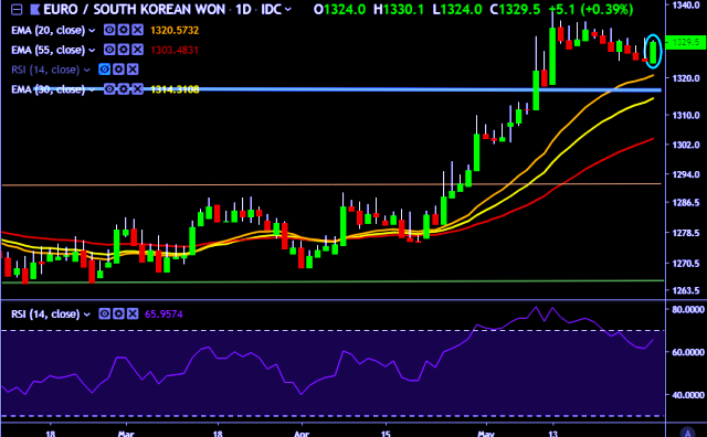 We prefer to take long position on EUR/KRW only above 1,330, stop loss 1,320 and target of 1,358.