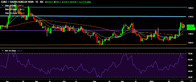 We prefer to take short position on EUR/KRW only below 1,315, stop loss at 1,327 and target of 1,302/1,290.