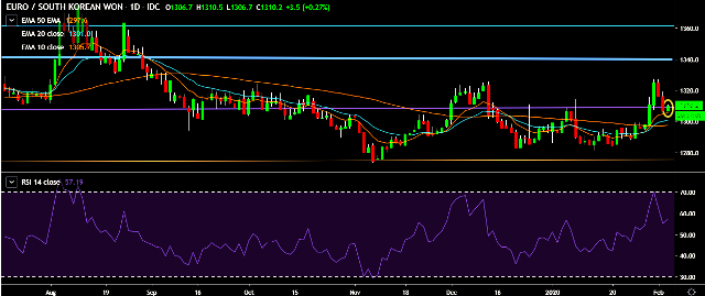 We prefer to take short position on EUR/KRW only below 1,306, stop loss at 1,320 and target of 1,290.