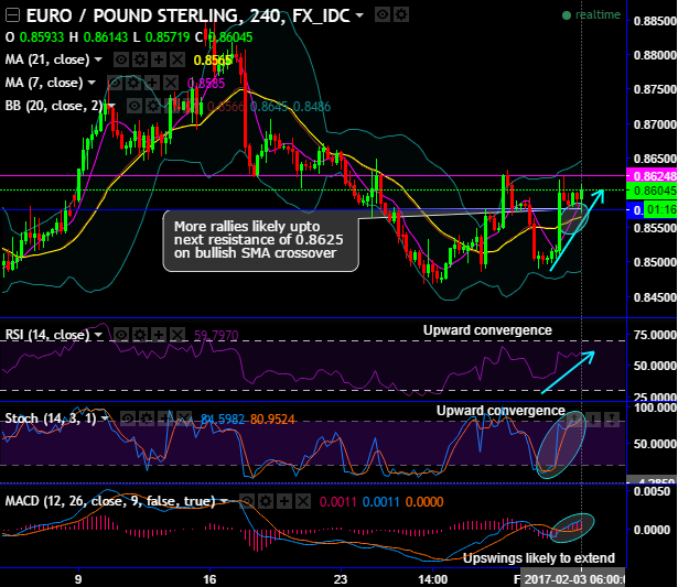 More rallies likely upto next resistance of 0.8625 on bullish SMA crossover.