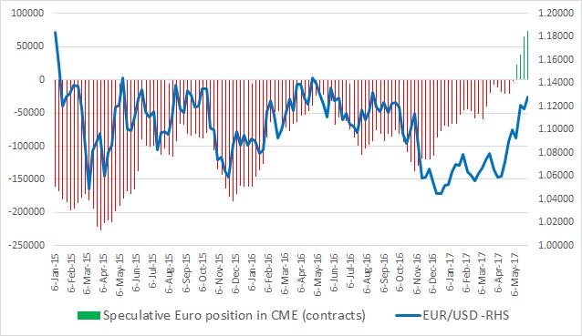 Since the French election, the euro rose from 1.06 against the dollar to 1.127 against the dollar as of today, while speculators turned bullish on the euro. The net speculative positions rose from -58.2K before the election to +72.9K as of last week. Speculators have now increased long positions for a fourth consecutive week.
