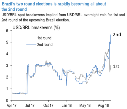 On the other hand, the modest pricing of the upcoming Brazil elections from earlier in the year has been replaced by viciously bid up election overnights (120vols). It mirrors the results we have had in the local polls (Ibope and Datafolha for example), which suggest that PT candidate Haddad’s momentum has improved and that he seems most likely to face candidate Bolsonaro in the 2ndround on October 28th(Brazil 2018 election: Haddad now takes the lead against Bolsonaro in the runoff simulations). ATM vols for the 2ndround have also adjusted and gained an upper hand on 1st round election vols (refer 1stchart), and as the election remains very uncertain, USDBRL 10/28 overnights may increase to levels last seen in 2018 Mexico election and Brexit referendum.