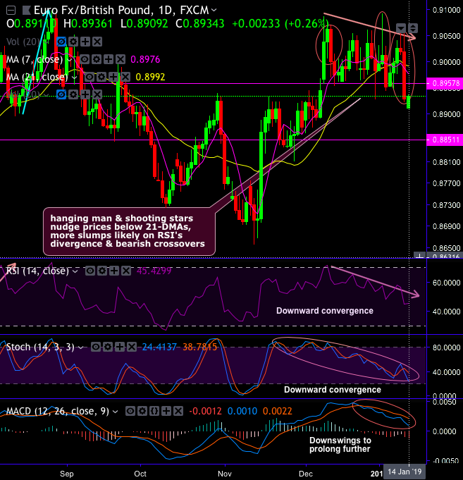 These bearish patterns have nudged the current prices below 21 & 7-DMAs, for now, more slumps seem likely on RSI's divergence and bearish DMA and MACD crossovers.