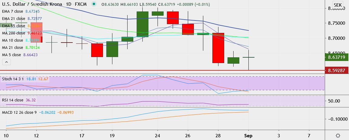 - USD/SEK trades 0.05 percent lower at 8.6360, having hit a low of 8.5954 earlier, its lowest since June 2018.