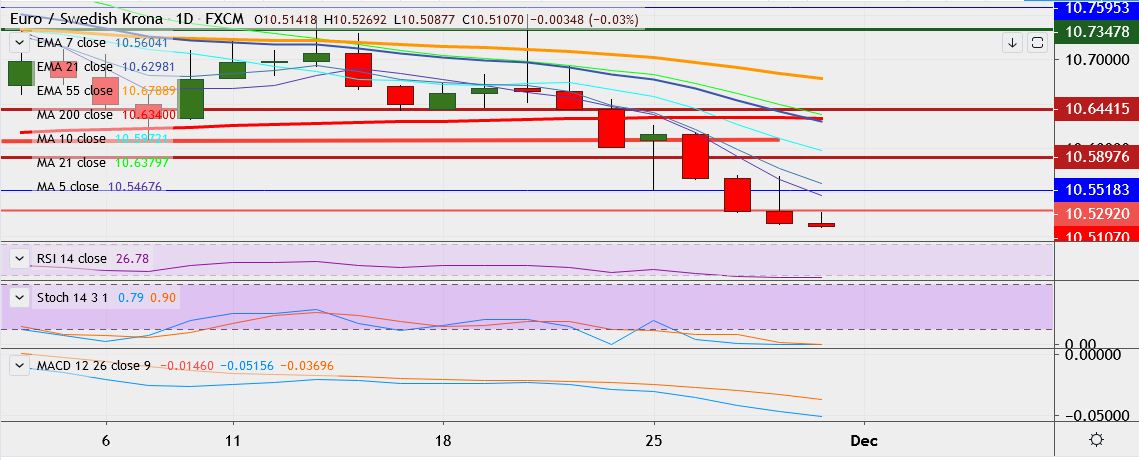- EUR/SEK trades flat at 10.5165, having hit a low of 10.5087 earlier, its lowest since July 25.